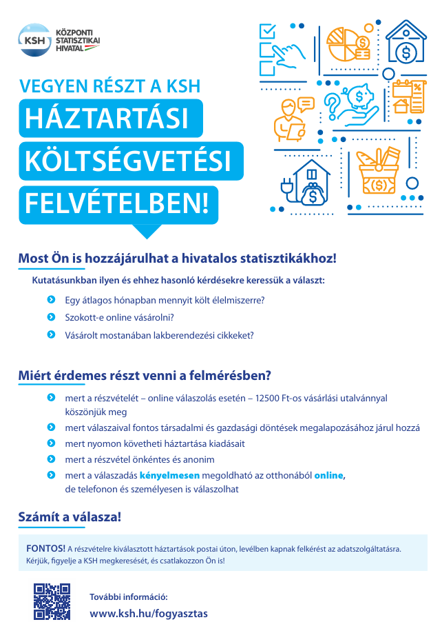 Kérjük segítsék a KSH munkáját!A felmérés 2025. december 18-tól - 2027 január 10-ig tart. A felmérés elsődleges célja, hogy az Európai Unió és tagállamai számára a lakosság fogyasztási és társadalmi-demográfiai adatairól összehasonlítható adatokat szolgáltasson. Ezen túl, alapul szolgál a fogyasztói ár-index számításánaksúlyrendszeréhez, valamint a nemzeti számlák felhasználási oldala lakossági fogyasztási részéhez.Az ország 685 településéről 25 034 cím került kiválasztásra a véletlen mintavétel szabályai szerint, akik, válaszadásrafelkérő levelet kapnak postán.A felmérés első tíz napjában van lehetőség a kérdőív interneten való kitöltésére, majd az ezt követő időszakban a KözpontiStatisztikai Hivatal megbízásából a Statek Statisztikai Elemző Központ Kft. (STATEK Kft.) fényképes igazolvánnyalellátott kérdezői keresik fel azokat, akik személyesen vagy telefonon keresztül szeretnének válaszolni. A kérdőív kitöltésemellett a felvétel részeként egy kéthetes blokkgyűjtésre/naplókitöltésre kérjük az adatszolgáltatókat. A KSH ellenőrizhetia terepen közreműködő kérdezők munkáját az adatgyűjtésben résztvevők újbóli megkeresésével.A válaszadás önkéntes.A felmérés egészében résztvevők internetes adatszolgáltatás esetén 12.500, összeírói közreműködéssel történtadatszolgáltatás esetén pedig 5.000 forint értékű vásárlási utalványt kapnak.